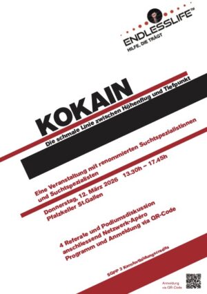 Am Donnerstag, 12. März 2026, veranstaltet EndlessLife zusammen mit renommierten Suchtspezialist:innen eine wichtige Fachtagung zum Thema Kokain im Pfalzkeller St.Gallen. Die Veranstaltung richtet sich an Fachpersonen, Interessierte und alle, die mehr über Ursachen, Auswirkungen und Hilfsansätze im Umgang mit Kokain-Konsum erfahren möchten.